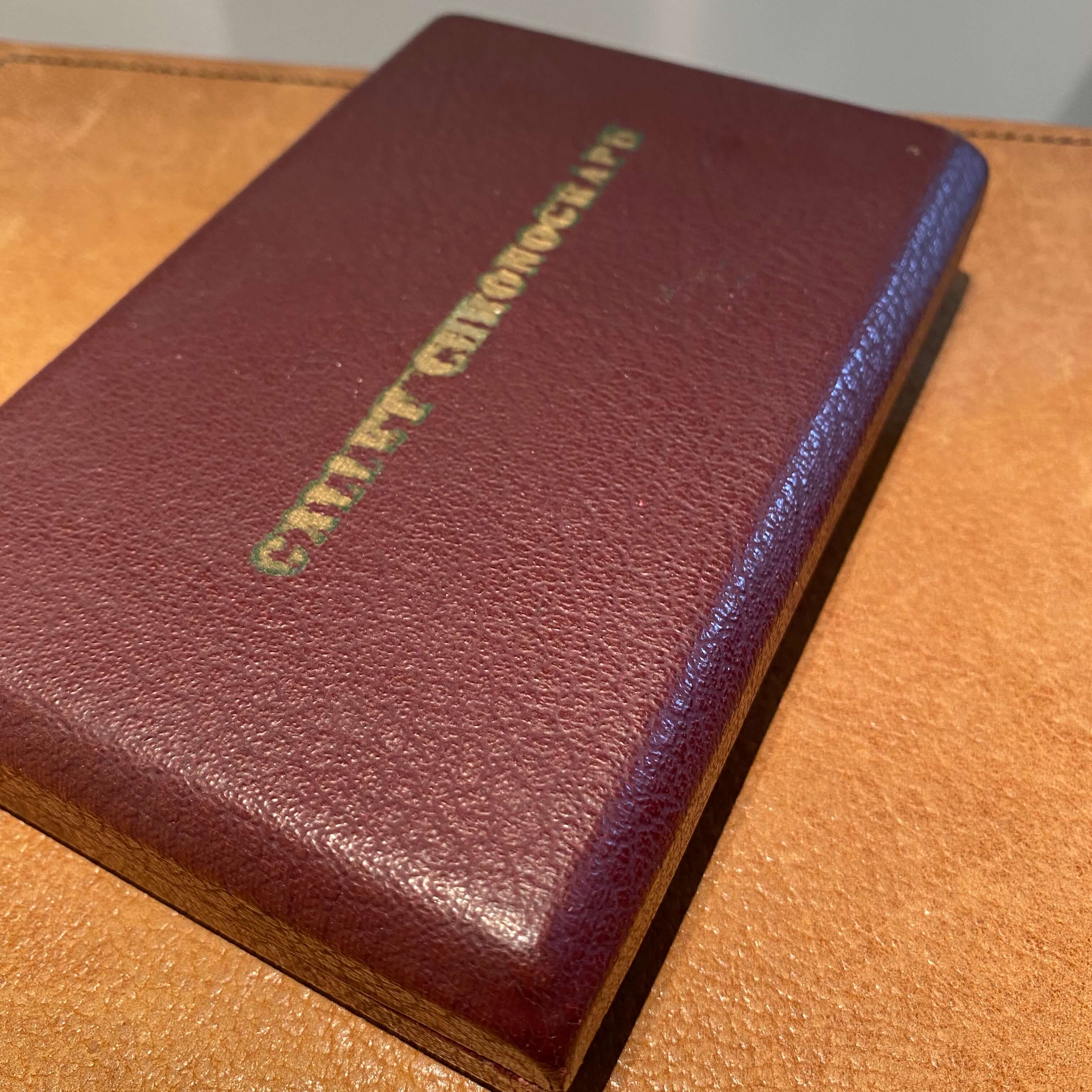 logo in gold/gilt script, over the red top cover.