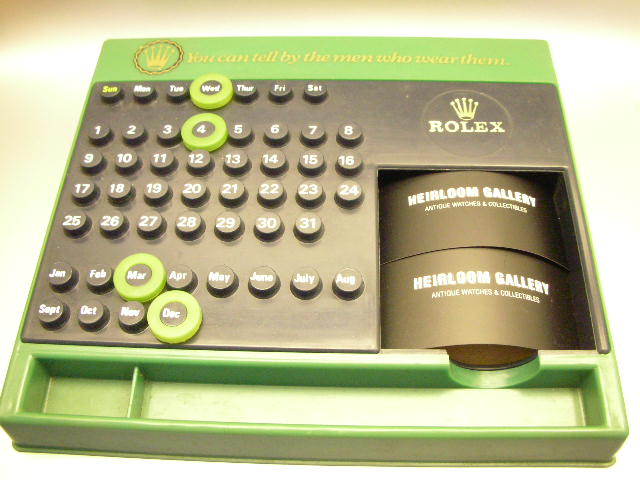 A very interesting early plastic ROLEX "Ring A Date Desk Calendar". Part of an early Rolex promotional material. This interesting item is made of early plastic in Rolex's official color GREEN. With Days of the week on the top row, follows by the DATE from 1 to 31 and MONTHs of the year. You can now check the tripledate & change the calendar (with the 4 rings provided) without destroying any trees. Very environmentally friendly too. Signed: You can tell the men who wear them, with 2 Rolex logo. On the back end of the calendar you will see the details of the authorised dealer, EASTEN WATCH CO, in gold script. From the telephone number, which is of 6 digits, you can tell that this is an OLD item as Singapore land line now has 8 digits. There is also space for your note pad, pens & pins, how thoughtful. Perfect for any shop or collector's shelf display. A very interesting early Rolex display. Doubt you will see another one for sale.