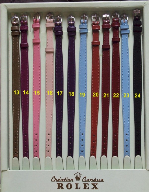Ladies, besides getting yourselves new dresses, shoes & hand bags, how about a change of strap for the beloved Rolex Cameleon of yours? With so many colors (some exotic ones) to choose from, this is one rare chance for you to do just that with these NEW OLD STOCK ROLEX CAMELEON STRAPS!! Limited stock of yellow, red, brown, pastel green, purple, blue, grey, beige, pink, baby blue, black & many many more ......... Hurry, while stock last !!!!! Please see last two pictures to select the colors (#1-24) that you like. 100% ORIGINAL Rolex straps with 100% ORIGINAL Rolex buckle. NOT COPY, NOT AFTERMARKET, 100% AUTHENTIC !! PRICE:S$200.00 EACH