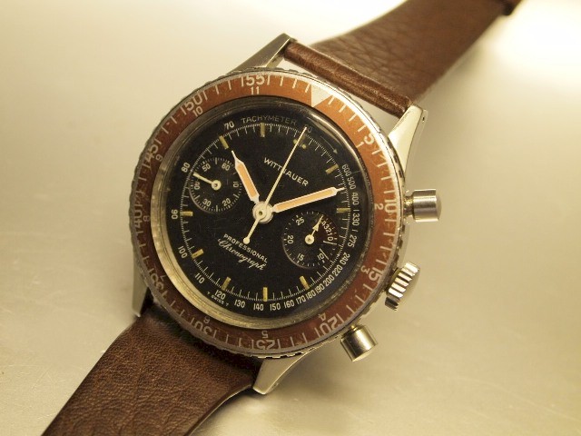 Vintage Witnauer Professional 2 registers chronograph with unique register at 3:00 & chocoloate brown bezel.