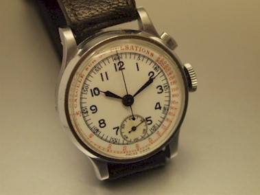 D/ Original grey dial with bronze TELEMETRE details around the edge of the dial. 2 registers with luminous markers and original hands set. C/ Original stainless steel snap back case with flexi lugs. Reminds me of an old Minerva chronograph with similar case design (See last picture). Case measures 33mm excluding crown, 35mm including & 50, yes 50mm from lug to lug!!!! M/ 17 jewels mechanical winding movement keeps accurate time & all chronograph functions work properly. |