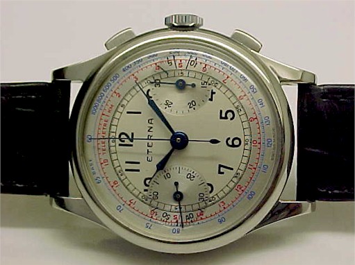 C/ Large size chromeplated top/Stainless steel back case in good condition. Look at the back case, engraved with EBERHARD & CO nice logo with set of reference numbers. Original Square pushers and original crown. Large Case size measuring 38mm excluding crown, 40mm including and 46mm from lug to lug. D/ Nice condition dial signed "EBERHARD & CO SWISS. 30 Minutes chronograph register at 3:00 & subsidiary seconds register at 9:00.Nice minute markers and chronograph details in blue script. Original hands set matching gold minute markers perfectly. Date aperture at 6:00 position showing Date of the month A rare feature in vintage chronograph of that era. You know what, the date numerals alternate in red and black color. Talk about attention to details!!!! . M/ High grade Swiss Made 21 jewels (NOT 17 but 21) Mechanical winding movement signed EBERHARD & CO SWISS.Recently serviced, keeps very good time and Chronograph functions operate perfectly. Round pushers start, stop and reset properly. Date quick set button at 9:00 position.