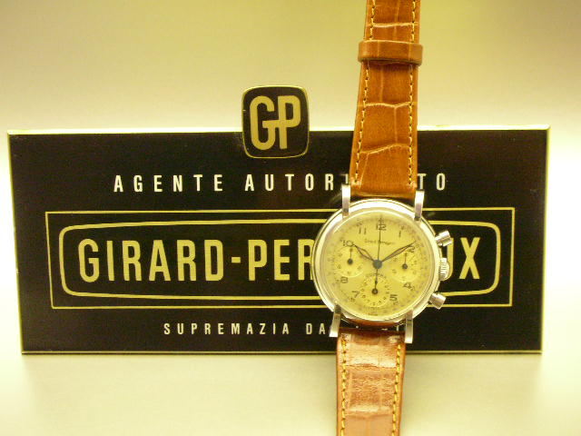 D/ 100% Original dial with 3 registers evenly aged with very charming patina. Subsidiary Seconds register at 9:00 position, 30 minutes chrono register at 3:00 position and 12 hours totaliser at 6:00. Signed "Girard Perregaux" in very nice antique script, and COMPAX above 12:00 register. Lovely Original luminous Blued steel hands set. C/ 100% Original stainless steel case with screw back in NEAR MINT Condition. Case measures 34mm exclduing crown, 36mm including and 42mm from lug to lug. Original round pushers with original crown. Look at the case design with special lugs construction. M/ Extremely clean and nice condition 100% Original GP Signed Cal 281 movement keeps accurate time. Chrono pushers start, stop and reset properly.NICE 100% ORIGINAL UNABUSED CONDITION. I MUST STRESS THAT OLD CHRONOGRAPH WITH NICE ORIGINAL DIAL AND CASE CONDITION IS VERY HARD TO COME BY NOW. THIS IS A RARITY!!! ref |