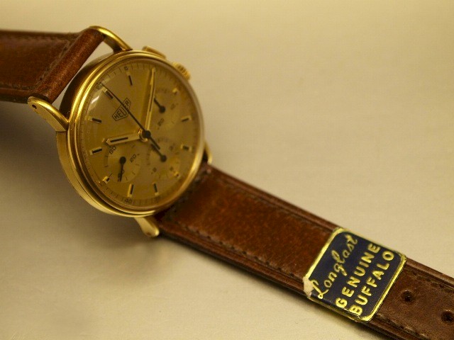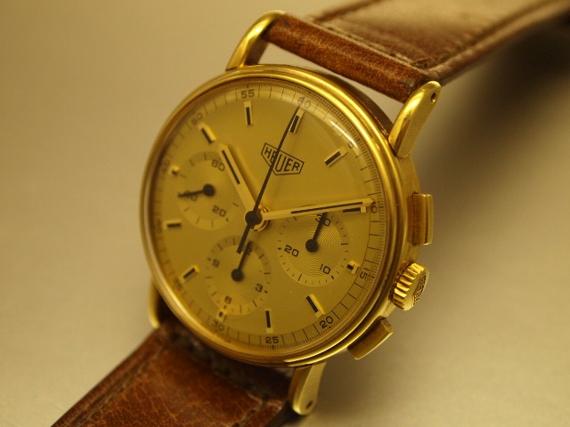 SOLID GOLD BABY CHRONO D / Original MINT condition dial with applied markers & original hands. Dial signed HEUER, Swiss Made below 6:00. Register at 3:00 counts to 30 minutes, 6:00 Register Counts to 12 Hours. 9:00 register shows constant seconds. C/ Original 18k solid yellow gold snap back case fully signed and hallmarked. Original Flat pushers & Heuer signed crown. Very cute rare small baby size measuring 32mmx34mmx38mm. About the size of a Singapore 50cents coin. M/ High Grade, Swiss Made, manual winding chronograph movement.Small baby size complications are very hard to find now. Highly collectible. |