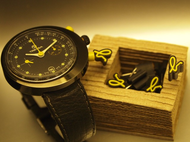 D / Original near mint condition matt black dial with round dot markers. Super retro original white hour & minute hands with rounded edges. Yellow chronograph, subseconds and 45 mins counter hands, matching the original yellow pushers perfectly. Dial signed TRESSA, Swiss Made in between the round date aperture. Register at 3:00 counts to 45 minutes, 9:00 register shows constant seconds. C/ Original black PVD case with s.steel screw back case. Original crown & pushers. Look closely and you will notice that the case is NOT exactly round, rather the dial is off-center giving a lopsided effect. Measuring 45mm excluding & 48mm including crown. M/ Swiss Made, manual winding valjoux chronograph movement. Keeps accurate time & all functions work properly.Just love the roundedness of this unique timepiece from its case to its hands & every little detail & the touch of yellow . . . |