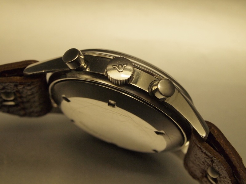 C/ Housed in a VERY VERY condition FULL Stainless Steel Original case with screw back case. ONLY VERY Light signs of wear on the case. No major dent or scratch. The case measures 36mm excluding crown and 44mm from lug to lug. Case fully signed and hallmarked. D/ Original MINT condition black dial with 30 minute chrono register and and subsidiary second register. Luminous 24 hours (instead of the usual 12 hours) markers with nicely aged patina. Original hands set with nice flyback hand. M/ Original signed mechanical winding 17 jewels C 4-68 movement in very clean condition. Keeps accurate time. Chronograph functions including Pushers start, stop and reset/flyback perfectly .