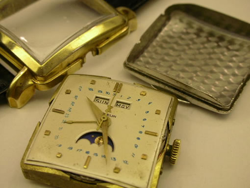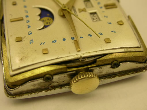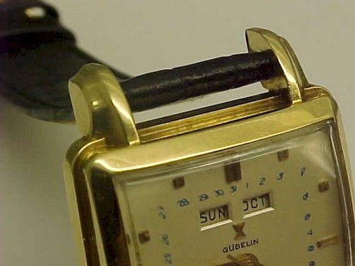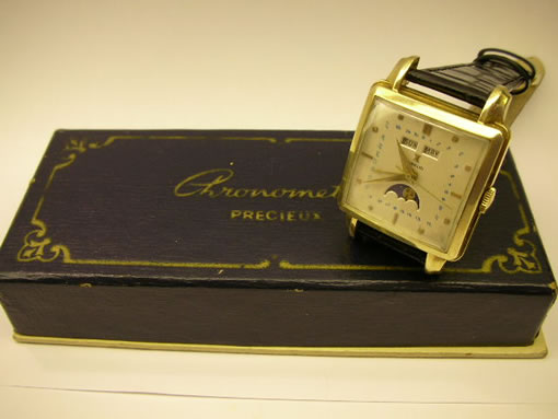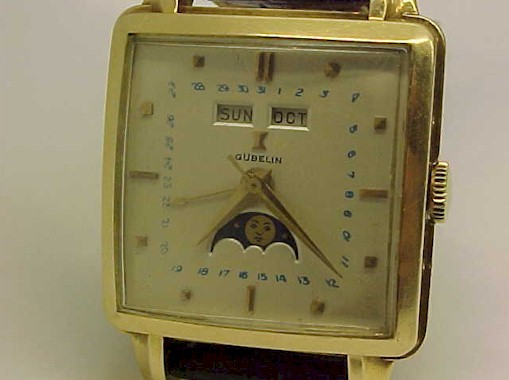 Extremely fine and rare, automatic SQUARE triple date moonphases by GUBELIN Ca. 1950s D: Matt Silver dial with raised gilt five minute marks with light signs of wear. The dial of the watch shows the date by means of a CIRCULATING hand that points at the BLUE date indices just inside of the chapters. Apertures for the days of the week and the months, in ENGLISH. The phases of the moon appear in a crescent just above the six o'clock position. There is additionally a central Sweep second hand. All of the complications can be advanced by means of depressing the buttons on the case sides. C: