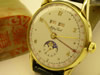 condition goldplated case with steel screw back. D: Fitted with a calendar and SUN phase display. Beautiful original dial in good condition with vintage patina with clear and fully legible details. SUN Phase register for day below 12 0'clock and subsidiary second register at 6:00. Outer Date Graduation. Original set of hands with Original date indicator with red tip. C: Very good condition s/steel case with snap back. Look at the special lugs design. M: Mechanical winding movement keeps accurate time. Quick set buttons work perfectly. Fitted with a brand new unused leather strap. THE LAST I HAD WAS ABOUT TWO YEARS AGO!! VERY RARE