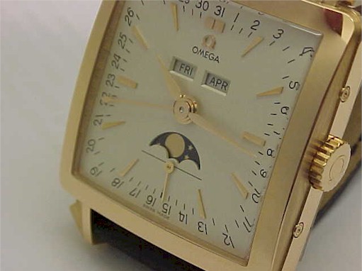 IWC 18K Y.GOLD NOVECENTO A MINT CONDITION, just serviced (Dec 2011) complicated wristwatch with very simple design, By IWC. It is also the FIRST rectangular AUTOMATIC PERPETUAL CALENDAR ever made. Most perpetual calendar watches have correctors/pushers at the side of the watch for quickset/corrections purposes and require some skills & care when you want to change the date etc. This is an early example of solution to the above headache, as all changes are made through the crown...quite an interesting piece. I personally like the rectangular case exuding the simplest dial construction in a perpetual calendar wristwatch you can find, add variation to your other circular cased perpetual calendar moonphases......
