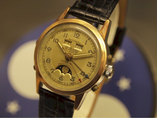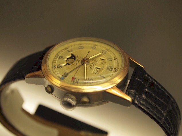 Rare vintage PRELY yellow goldfilled Tripledate Moonphase chronograph with beautiful original dial and case. Circa 1955. With a size of 38x40x42mm. For vintage watches, this is considered LARGE! D/ 100% Original dial in very nice vintage condition signed PRELY GENEVE SWISS MADE. DAY & MONTH (in ENGLISH) apertures below 12:00. 30 minutes counter at 3:00 and subsidiary seconds register at 9:00. Moonphases indication at 6:00. Original hands set with light oxidisation. Original Calendar hand with red tip. C/ Original yellow goldfilled top case with stainless steel snap back case in very good condition with light signs of wear. Original Crown, Original olive pushers and Correctors with light oxidisation. Huge case measures 38mm excluding crown, 40mm including and 44mm from lug to lug. M/ Original Landeron 186, 17 JEWELS Mechanical winding movement. Keeps accurate time, all chronograph and tripledate moonphases functions work accordingly. |