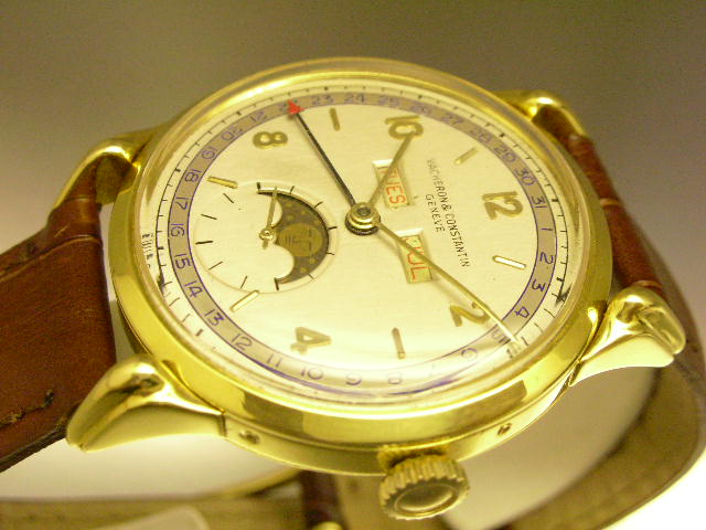 18K SOLID GOLD UNIVERSAL TRICOMPAX Ca 1942 gentleman's wrist watch with square buttons chronograph, triple date and moonphases. Universal Tricompax has always been a highly sought after complicated vintage watch. D/ Original dial with applied markers showing: subsidiary seconds at 9:00, 30 minutes register, 12 hours chronograph totaliser, the date of the month, outer tachometer graduation, apertures for the days of the week and the months of the year (BOTH IN ENGLISH) and the lunations i.e. moonphases at 12:00. Matching gold hands with blued steel subsidiary hands. Look at the Red date pointer, it is not only so cute looking it makes date telling a lot easier too !!!!! C/ Original 18k solid gold snap back case, fully signed and hallmarked by Universal. Original Flat pushers. M/ Original UNIVERSAL Signed Cal. 283 mechanical winding movement keeps accurate time. All chronograph functions work accordingly.UNITRICOMPAX2014 |